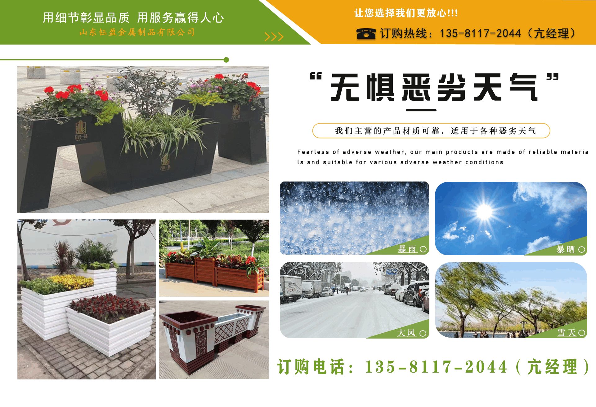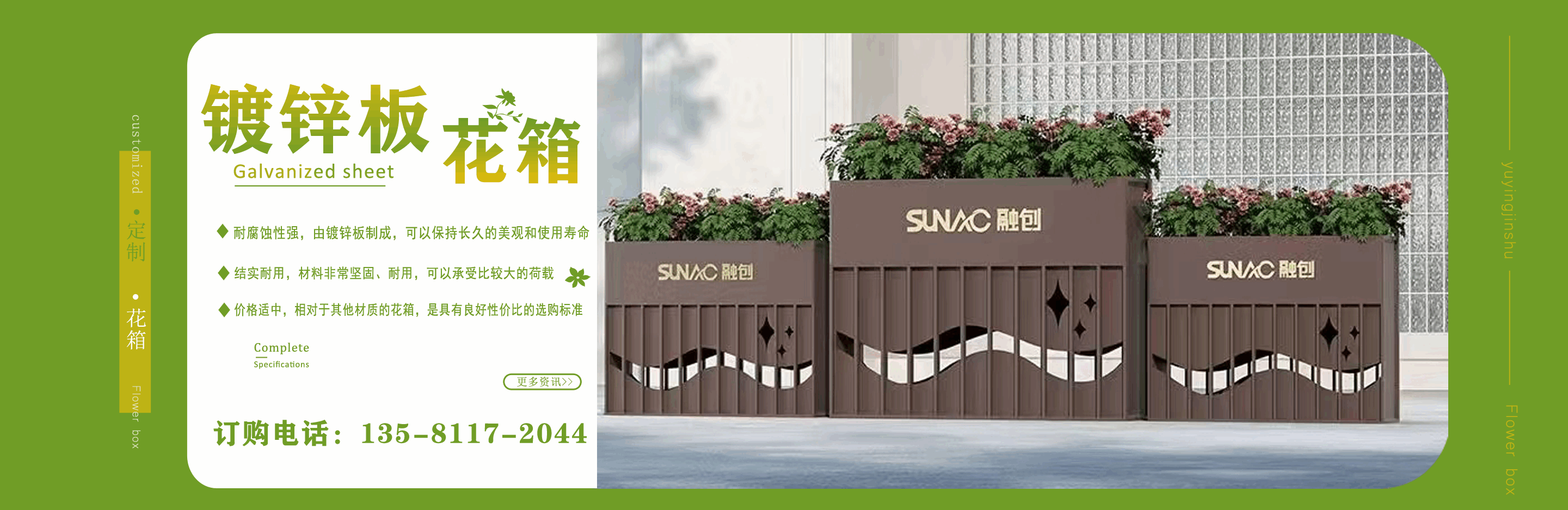 山東鈺盈金屬制品有限公司主營鍍鋅板花箱,道路隔斷花箱,定制花箱,戶外道路花箱,花箱座椅等產(chǎn)品,產(chǎn)品結(jié)構(gòu)合理、性能優(yōu)良,具有強度高、耐腐蝕、抗老化、隔熱隔音、節(jié)約能源、外形美觀、使用壽命長等優(yōu)點,深受國內(nèi)外客戶認(rèn)可?! ∥覀兏鶕?jù)客戶所在城市的文化特征,制造出符合當(dāng)?shù)爻鞘形幕瘹庀⒌淖匀涣Ⅲw、觀賞性強的花箱產(chǎn)品成為城市里一道靚麗的風(fēng)景線?! 」緦嵭姓\實、公正、守信、價格合理、平等互利。 公司憑借雄厚經(jīng)驗實力,恪守誠信為本的原則,得到了眾多客戶的信賴,并在業(yè)界獲得良好的口碑。建立了穩(wěn)固的合作關(guān)系,隨著業(yè)務(wù)的不斷發(fā)展和壯大,合作伙伴的范圍也在不斷擴大。我們熱情盼望與您的合作,為社會的可持續(xù)發(fā)展獻上一份努力。...